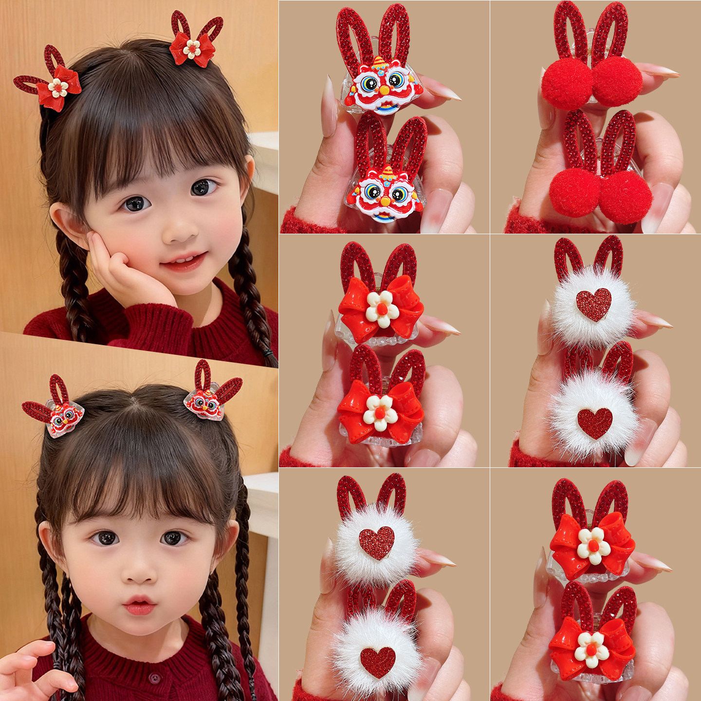 2026新年装饰红色醒狮蝴蝶结侧边夹发夹女儿童刘海小抓夹过年头饰