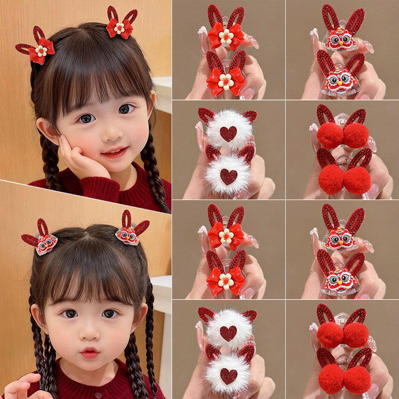 红色兔耳朵蝴蝶结发夹侧边刘海小抓夹女2024新款发卡新年过年头饰