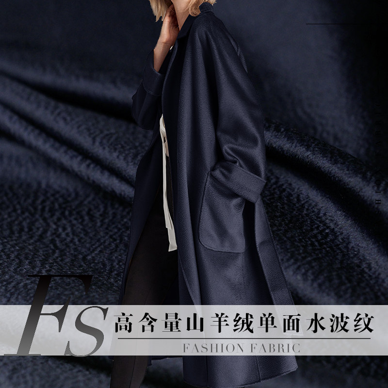 FS风尚藏青高含量山羊绒水波纹布料秋冬女装羊绒大衣高档服装面料