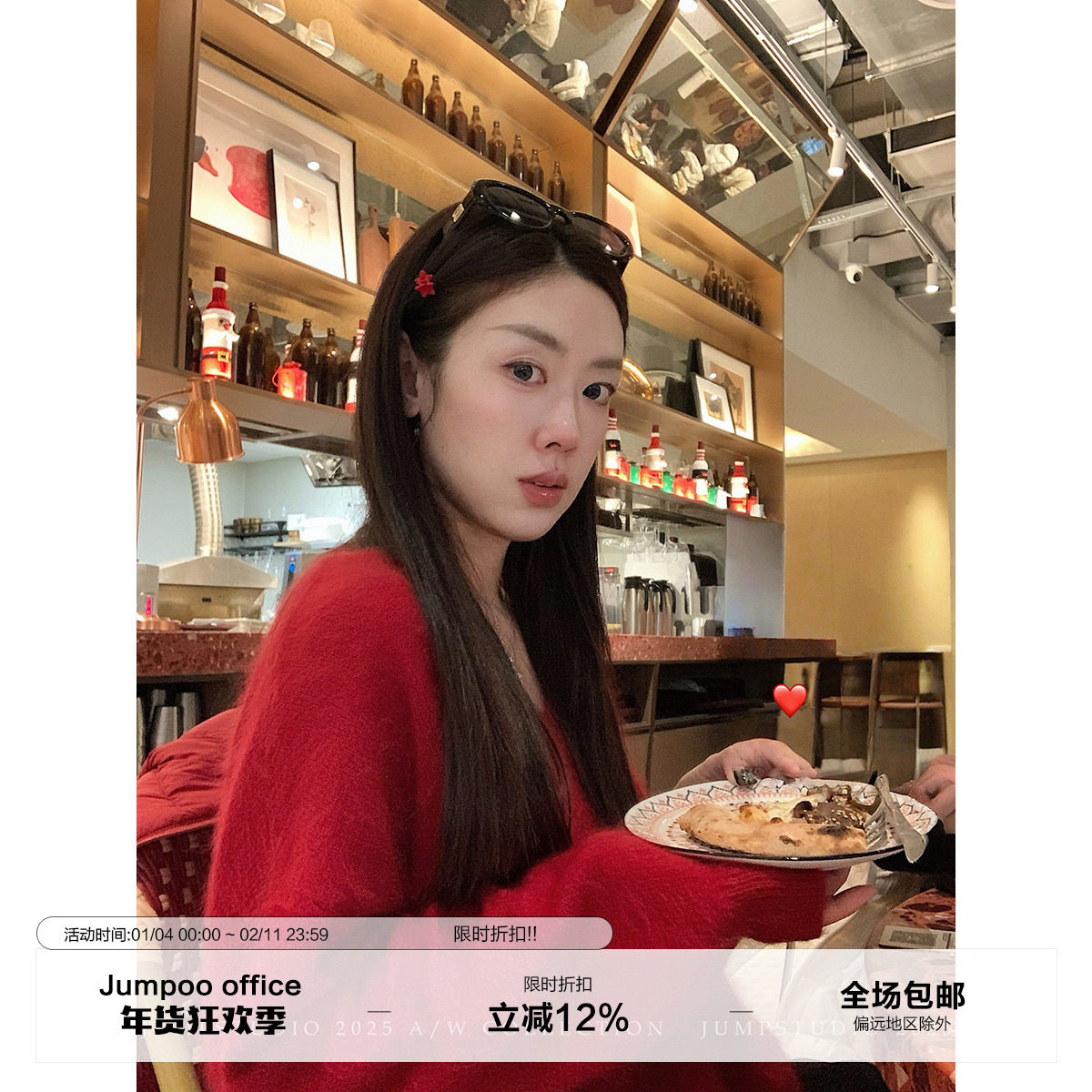 pusumede 节日氛围 正红色v领菱格套头毛衣女修身撞色针织衫上衣