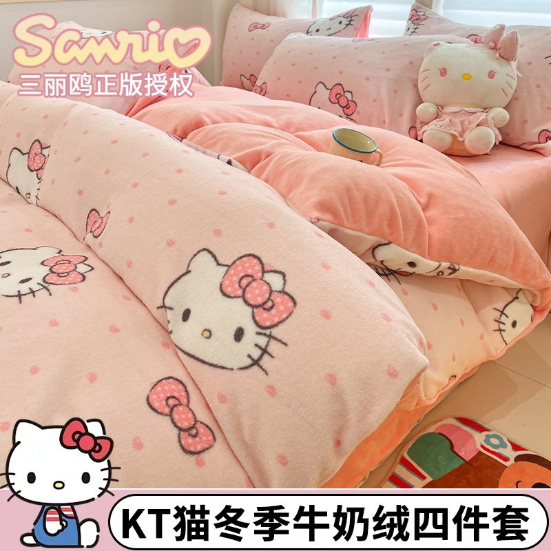 A类牛奶绒hellokitty四件套加绒加厚儿童床单被套少女心三件套冬