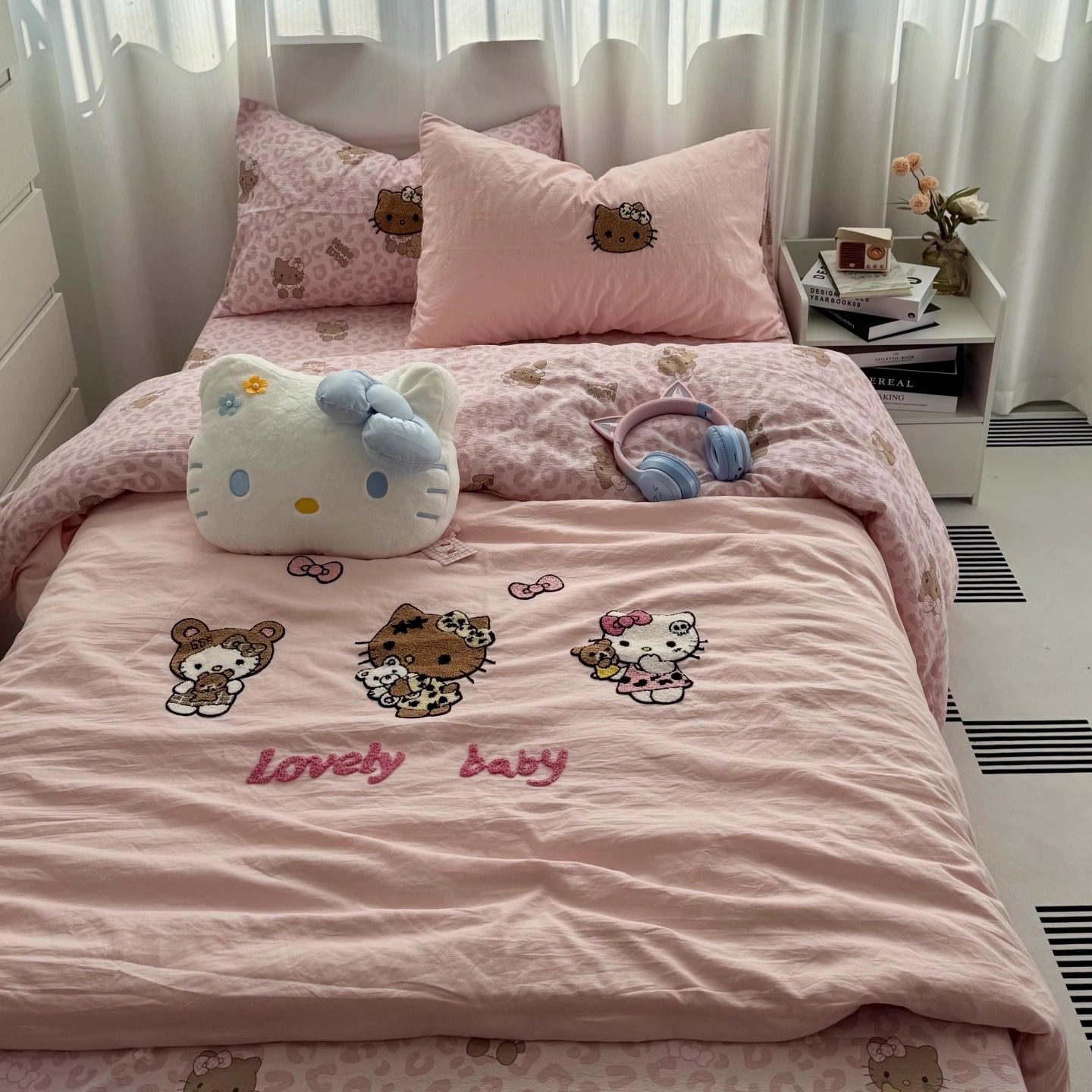 ins粉色豹纹HelloKitty毛巾绣全棉水洗棉四件套宿舍1.5被套三件套