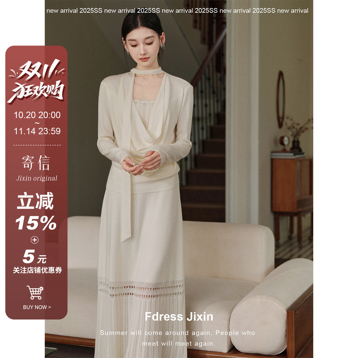 寄信《栖羽》羊毛/假两件长袖上衣白色镂空针织半身裙气质两件套