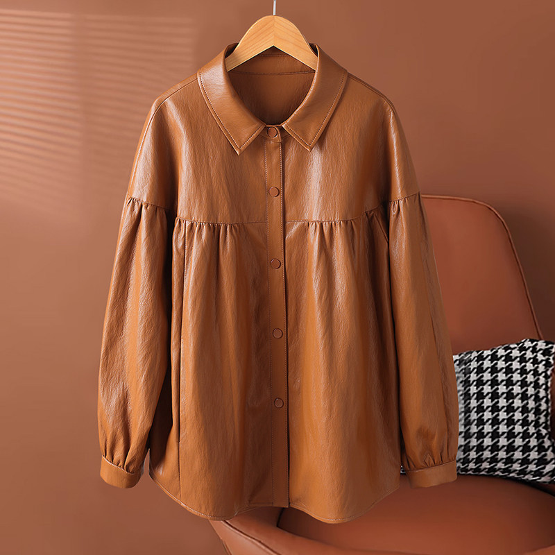 2026春季新款真皮皮衣女中长款衬衫式绵羊皮夹克宽松显瘦大码外套