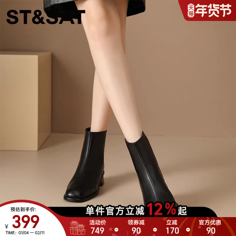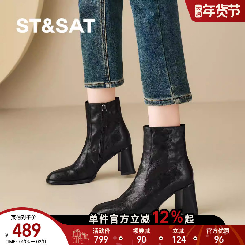 星期六秋冬新款法式方头短靴女粗跟时装靴女高跟瘦瘦靴百搭切尔西