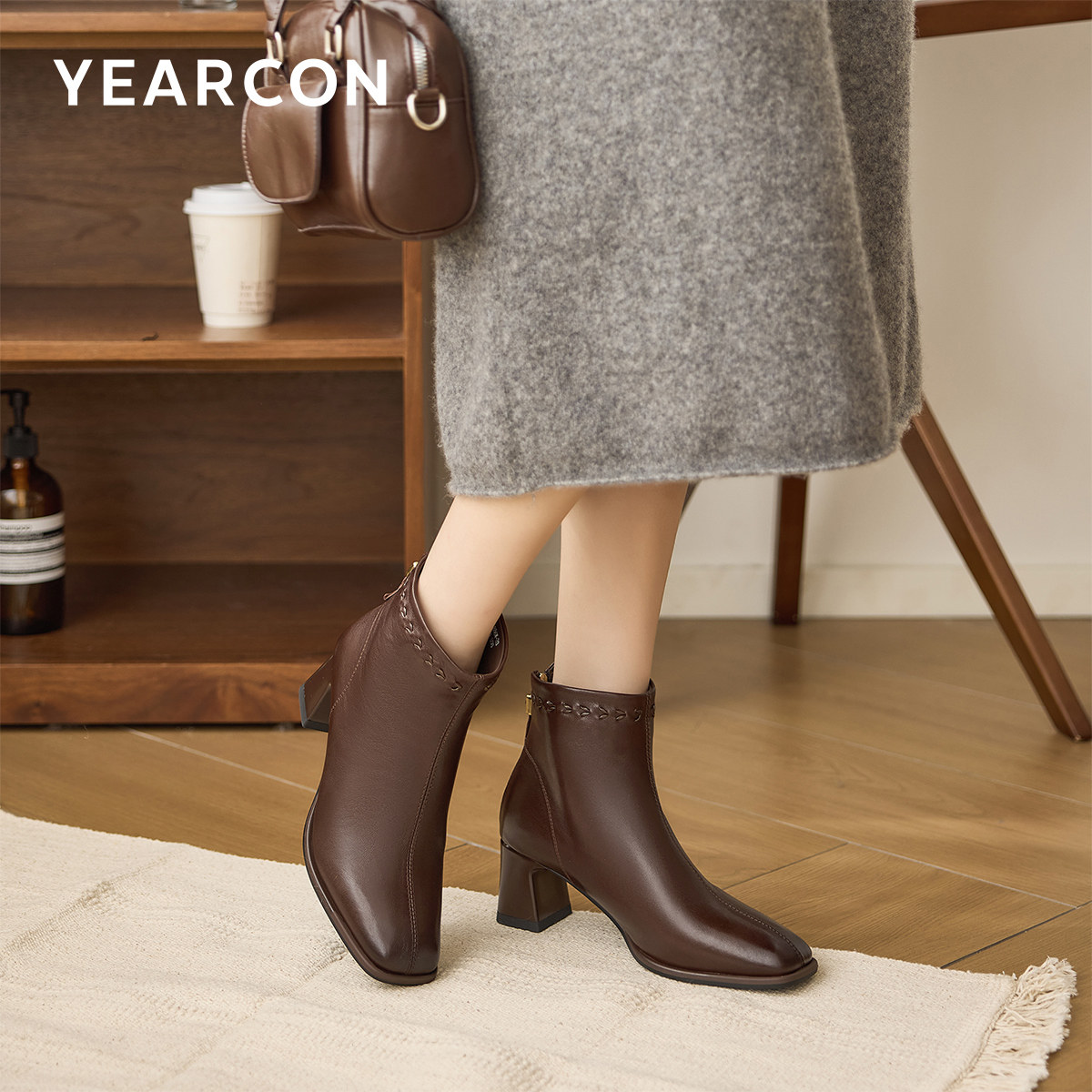 Fermina 法式复古方头短靴女粗跟通勤静音跟女靴真皮软面单靴体制