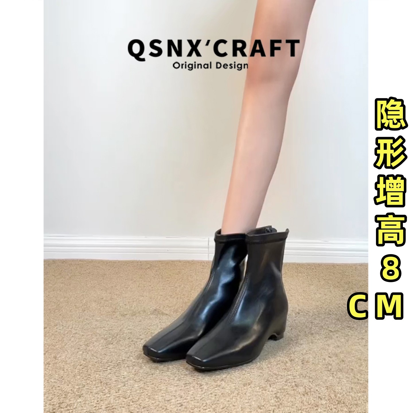 真皮版~韩版方头短靴女2025秋冬小个子内增高瘦瘦靴百搭小踝靴子