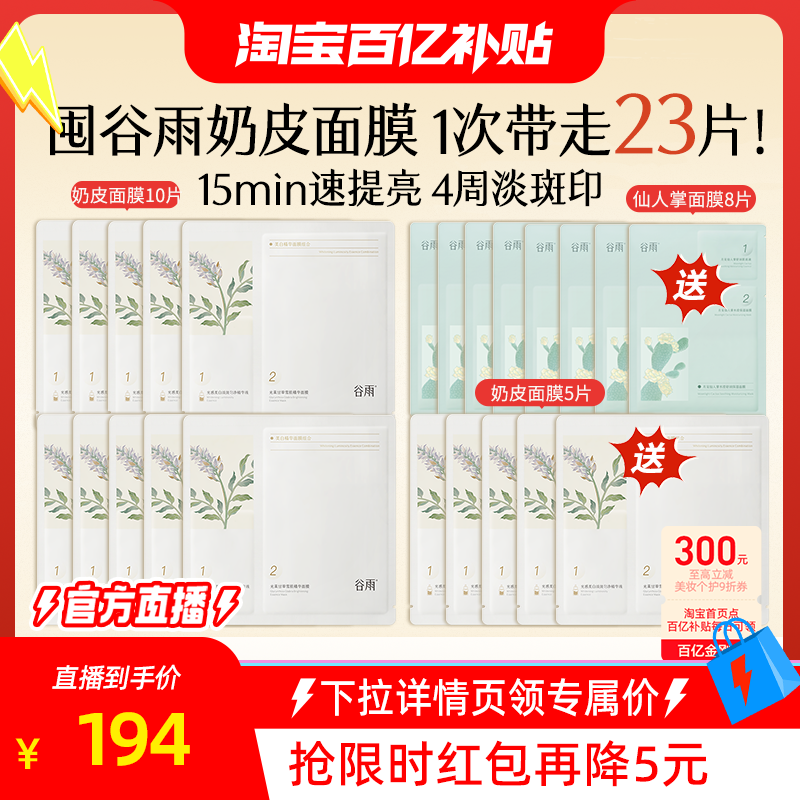 谷雨奶皮面膜修护美白去黄暗沉淡斑+补水保湿仙人掌面膜组合3片