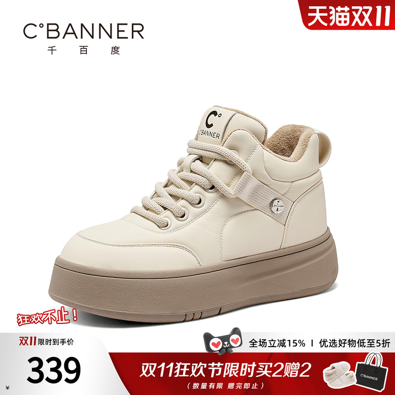 百丽厚底加绒高帮鞋女鞋冬季新款棉鞋增高鞋百搭小白板鞋E6S1DDD5