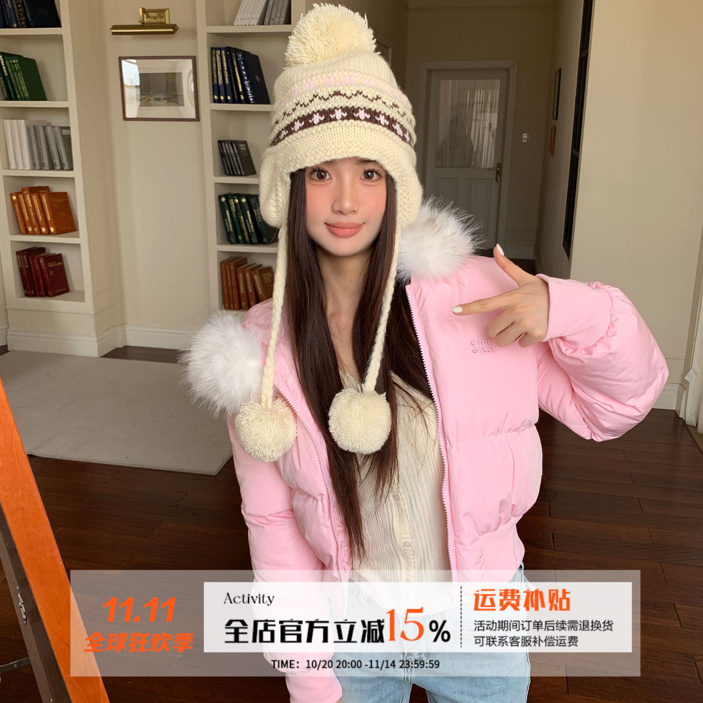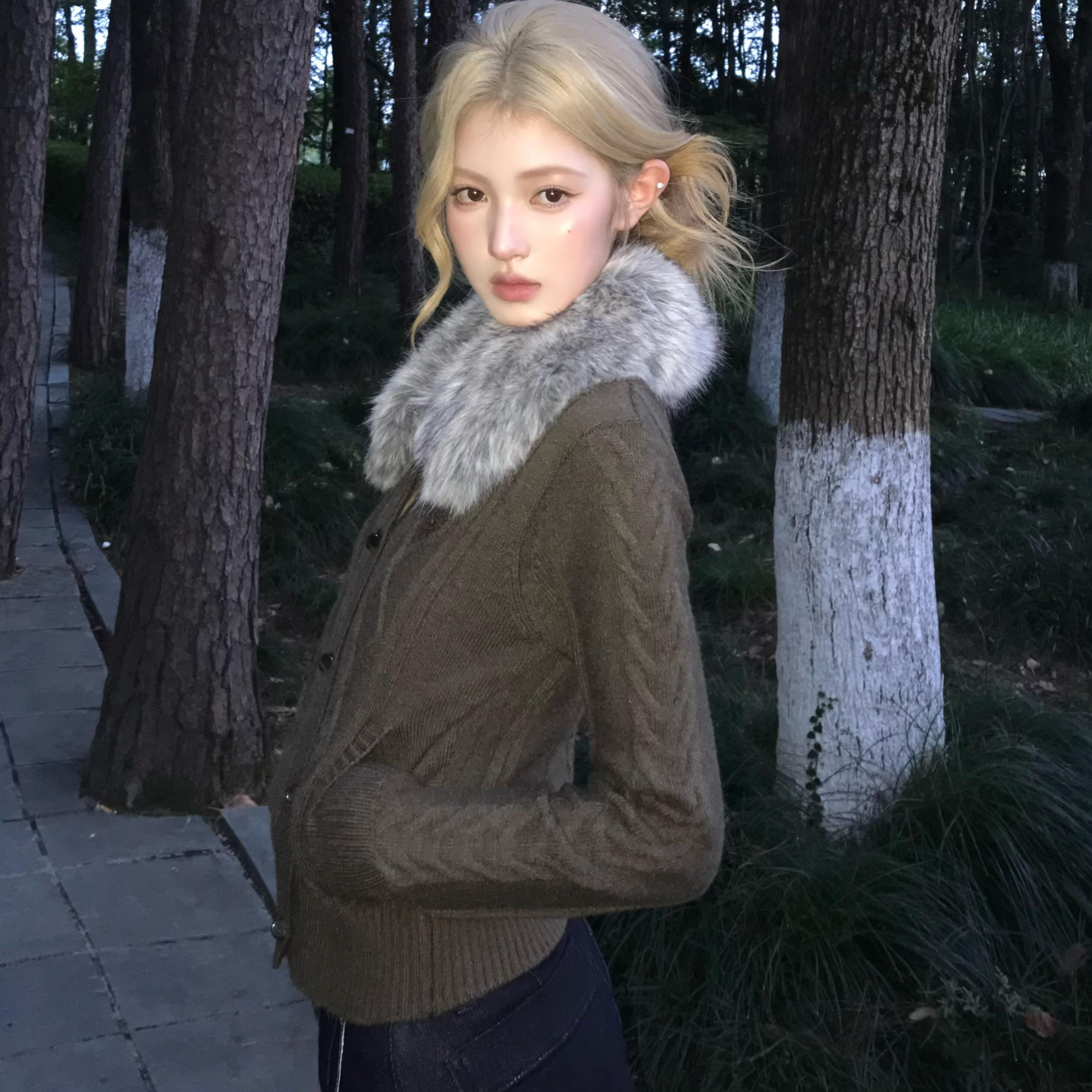 ELUCP 超大狐狸毛领连帽麻花毛衣针织开衫秋冬保暖修身显瘦短外套
