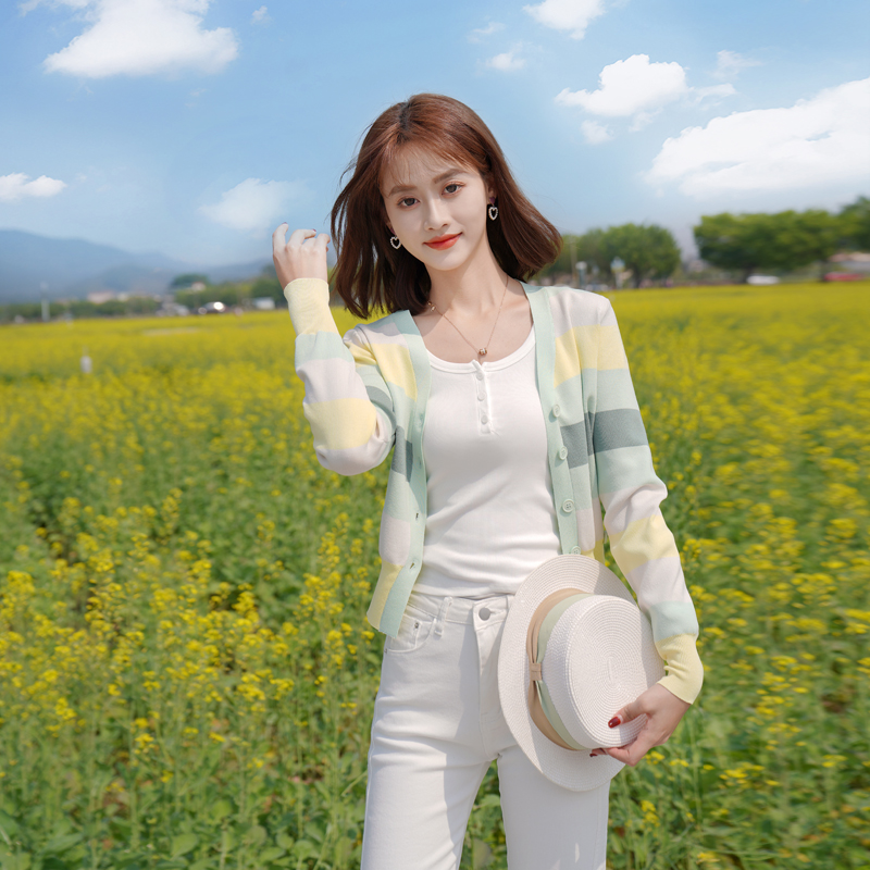 ATAR春秋季新品靓丽宽条纹V领针织开衫 2025修身显瘦短外套空调衫