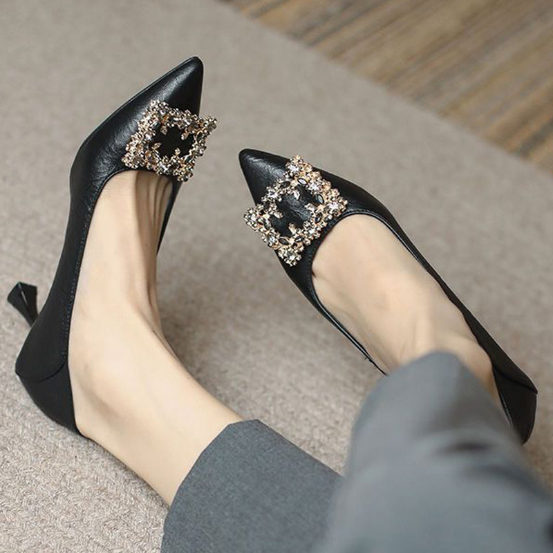 香港高跟鞋女2025年新款细跟气质高级水钻方扣配裙子百搭尖头单鞋