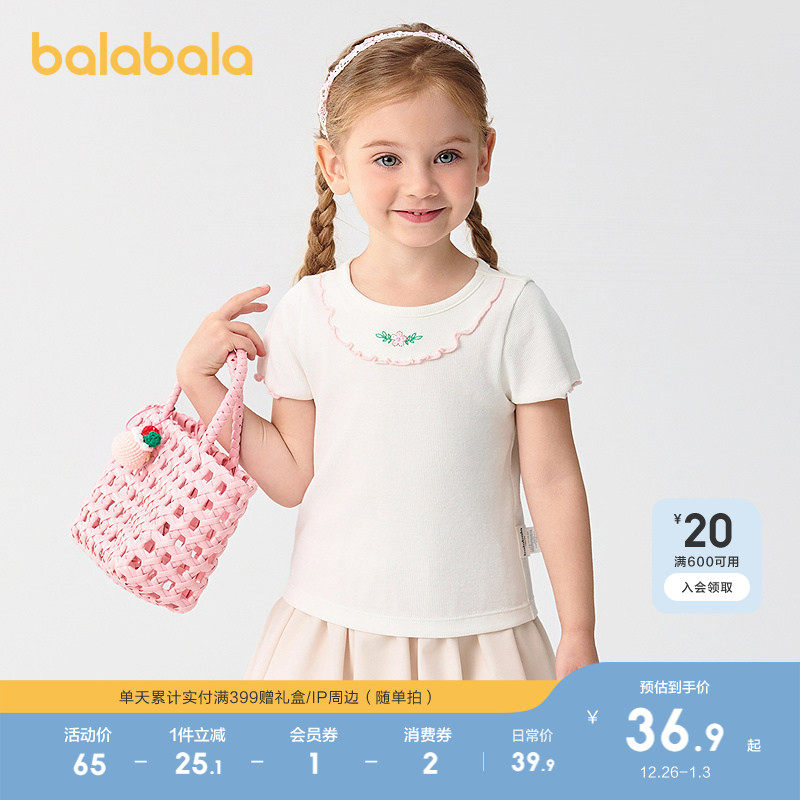 巴拉巴拉童装宝宝短袖女童T恤儿童上衣2025新款夏装正肩内搭绣花