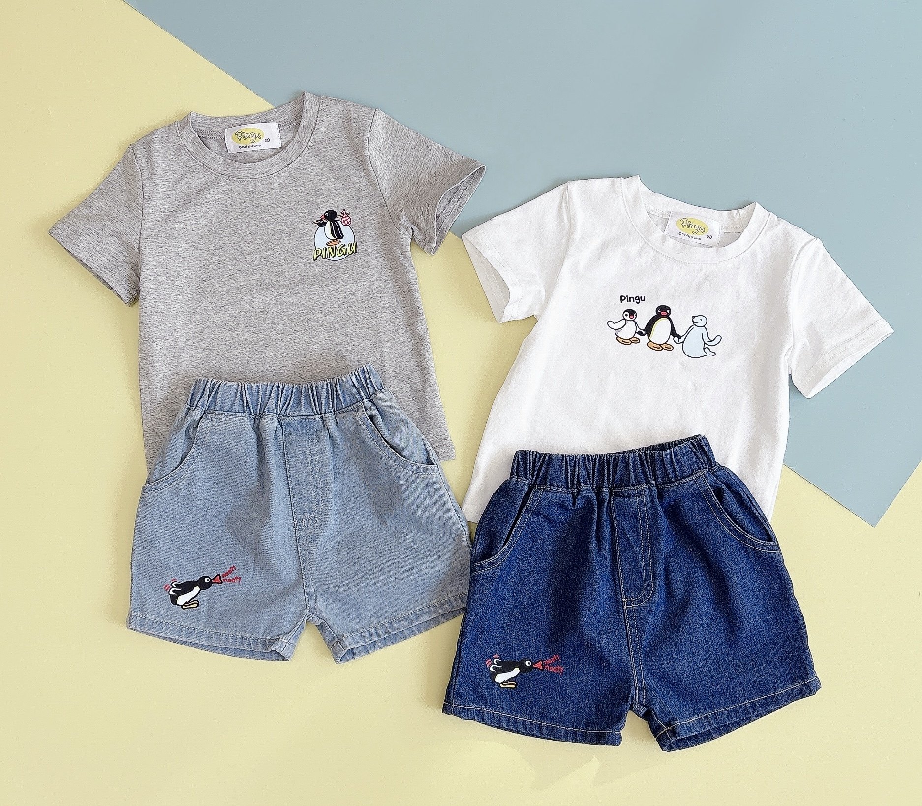 日单26春夏新款pingu男女童宝宝短袖T恤上衣裤子牛仔短裤纯棉套装