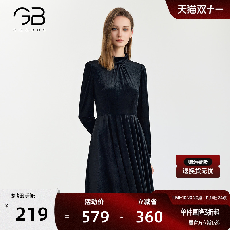 谷邦丝绒收腰连衣裙女2025秋冬新款蕾丝边拼接中长款千金风小黑裙