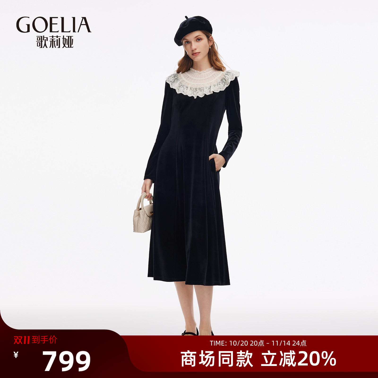 歌莉娅连衣裙女秋季新款高级感气质蕾丝拼接黑色丝绒裙1C1R4H470