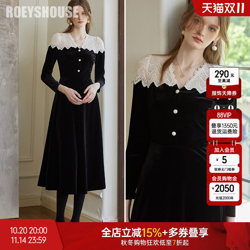 罗衣法式丝绒拼接蕾丝连衣裙女2025秋冬新款高级黑色礼服裙09708
