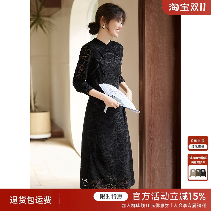 XWI欣未新中式丝绒蕾丝连衣裙女2024冬季黑色优雅盘扣国风旗袍裙