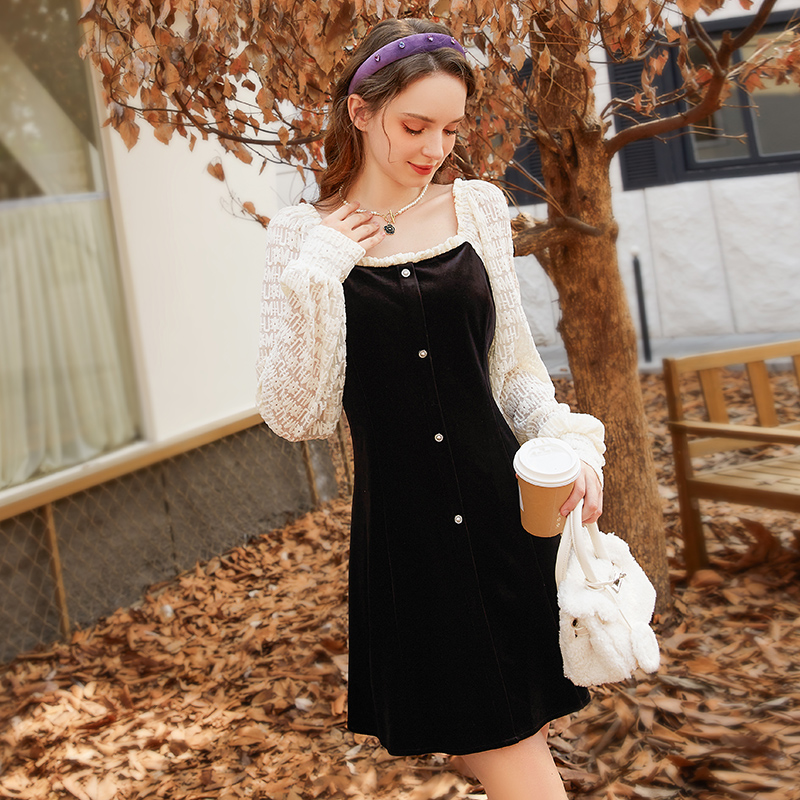 小香风拼接蕾丝黑色丝绒连衣裙女冬装赫本风法式方领miu系a字裙子