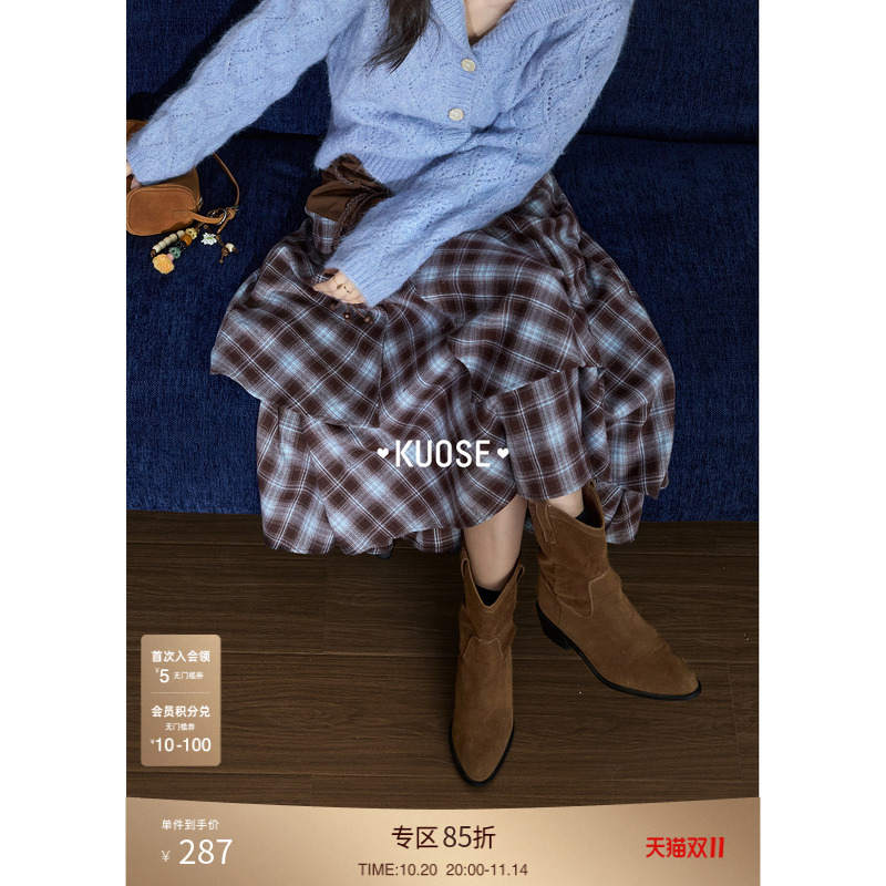 阔色不规则格子半裙伞裙a字裙2025秋冬季穿搭新款女长裙子半身裙