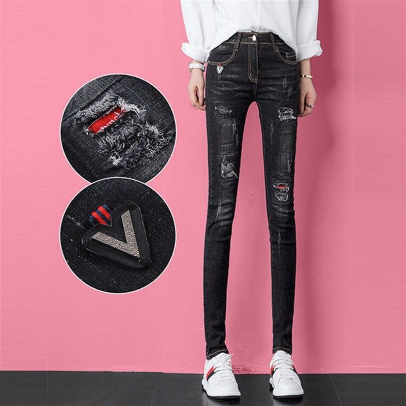 - 破洞牛仔裤女小脚裤显瘦长裤