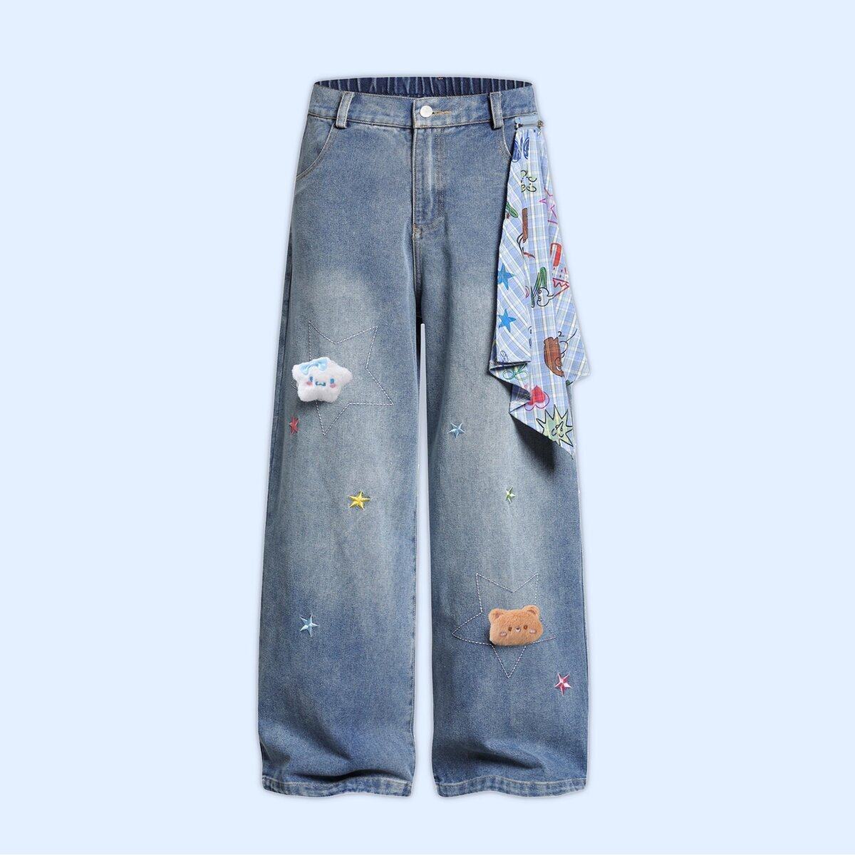 美式刺绣星星可拆卸方巾牛仔裤男2025新款宽松bf慵懒风阔腿裤子长