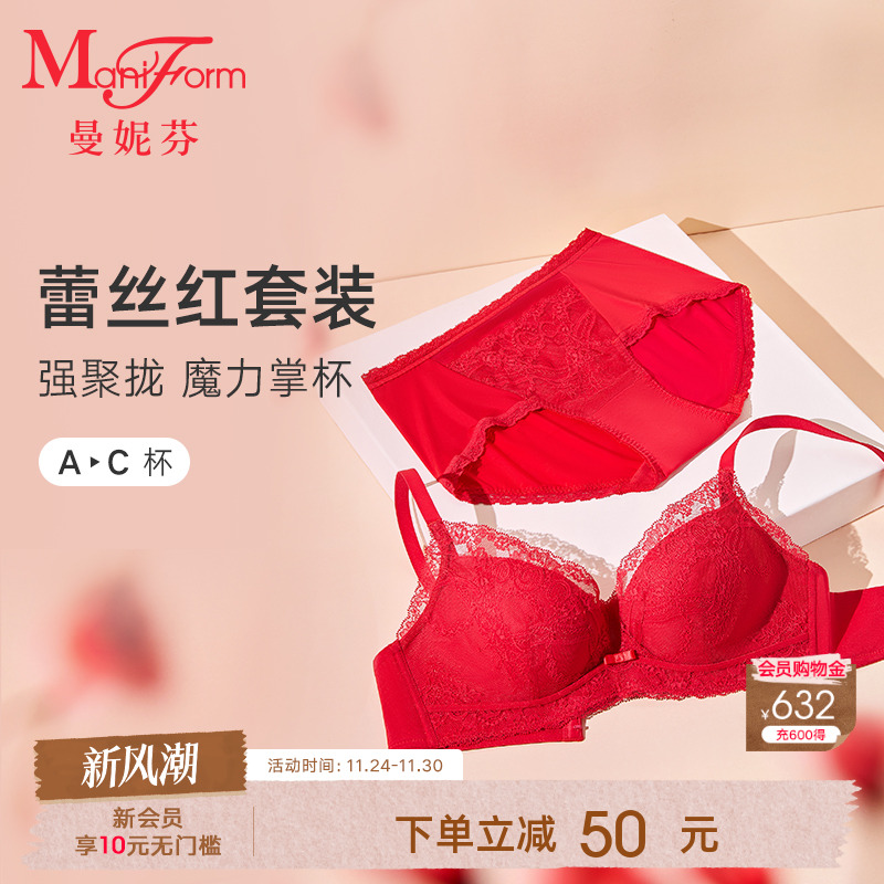 曼妮芬红色内衣套装性感蕾丝刺绣文胸内裤女士结婚新娘本命年胸罩