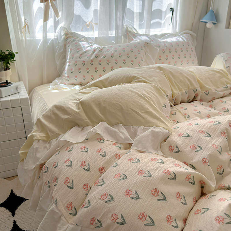 少女花边学生宿舍床上三件套全棉床笠床裙被套床单四件套纯棉四季