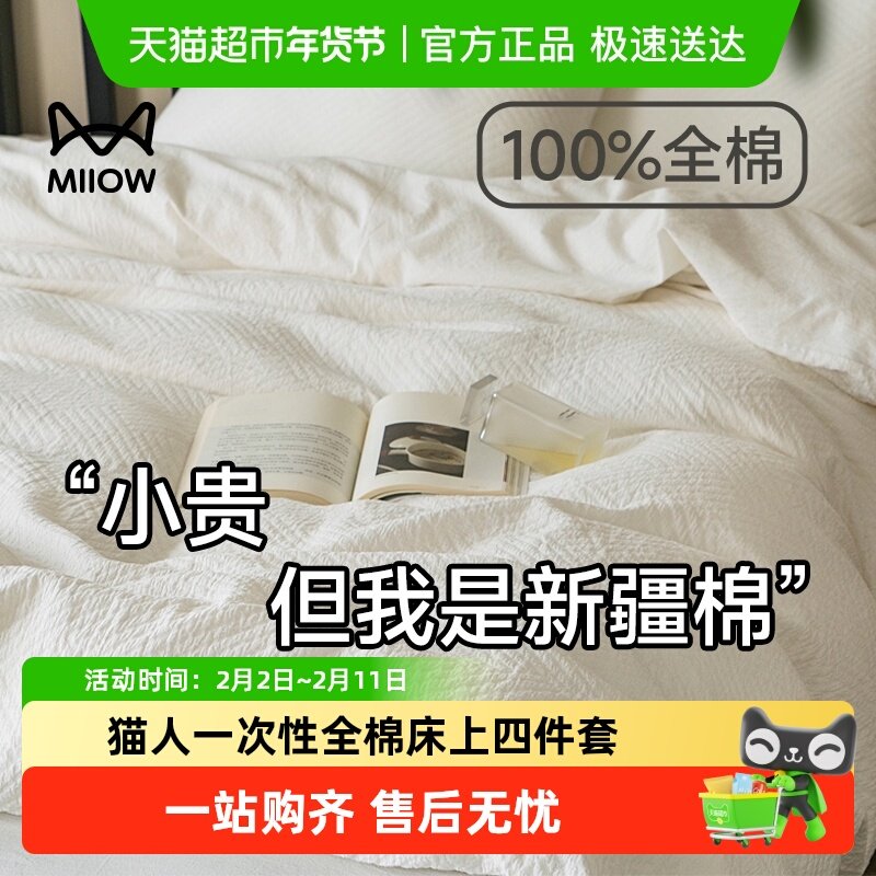 猫人A类100%全棉一次性床单四件套纯棉被罩枕套被套酒店旅行隔脏
