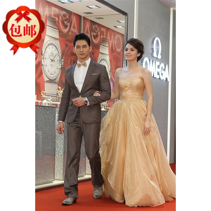 张榕容抹胸香槟金网纱礼服裙甜美长款晚礼服拖尾时尚敬酒服晚长裙
