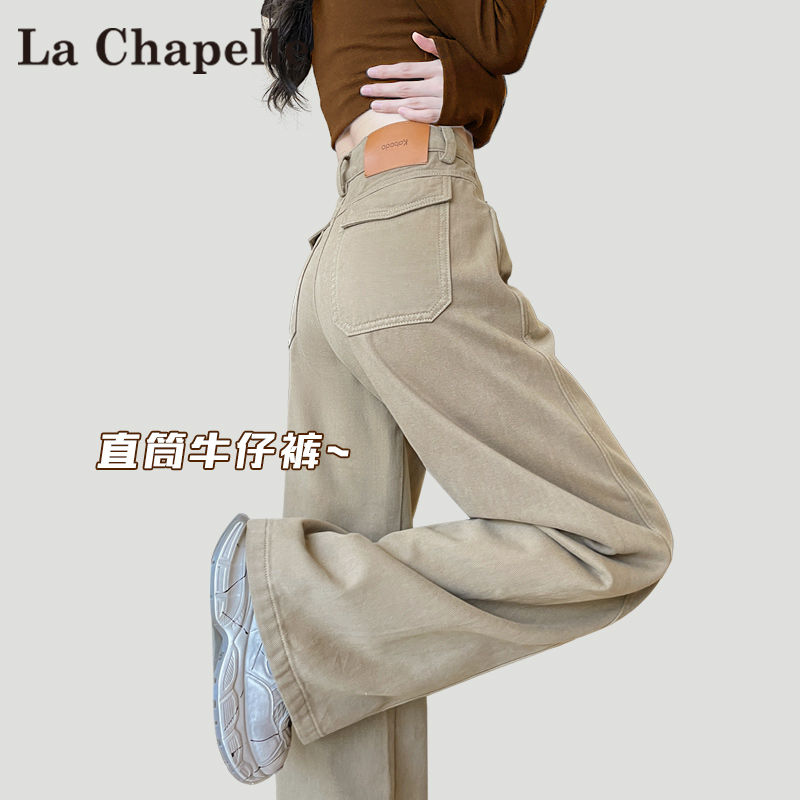 拉夏贝尔卡其色弯刀牛仔裤女秋冬2025新款高腰显瘦加绒镰刀阔腿裤
