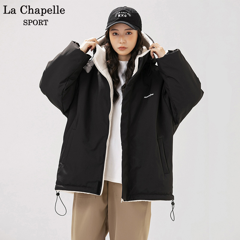拉夏贝尔/La Chapelle秋冬新款连帽纯色仿羊羔绒外套女宽松上衣