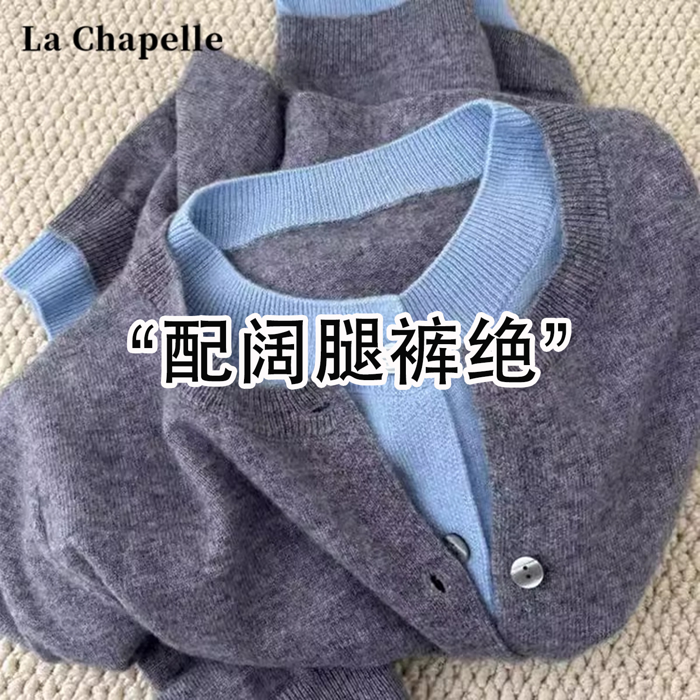 拉夏贝尔藏青色撞色针织衫女秋季2025新款假两件毛衣开衫长袖上衣