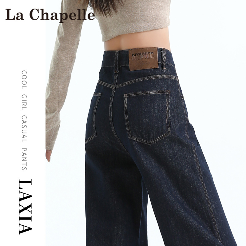 拉夏贝尔深蓝色窄版直筒牛仔裤女春秋2025新款高腰冬季加绒阔腿裤