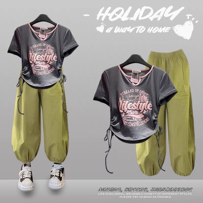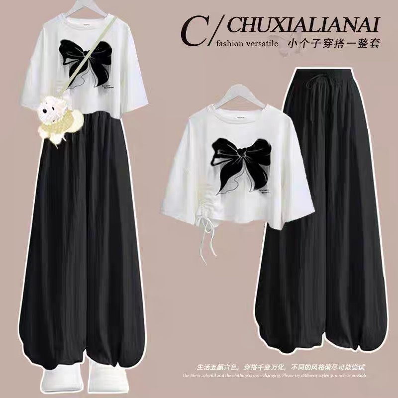 夏季套装女学生大童时髦洋气短款t恤高腰显瘦工装阔腿裤两件套潮