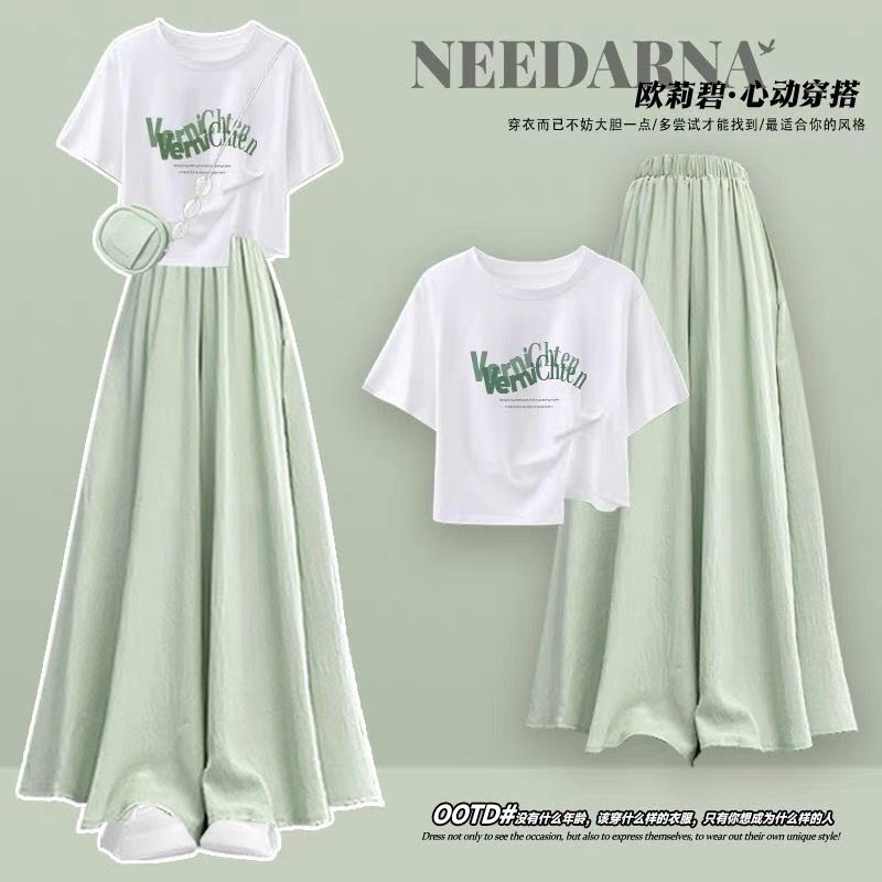 韩版短款T恤套装女甜美温柔风上衣夏季中大童时尚阔腿裤裙两件套