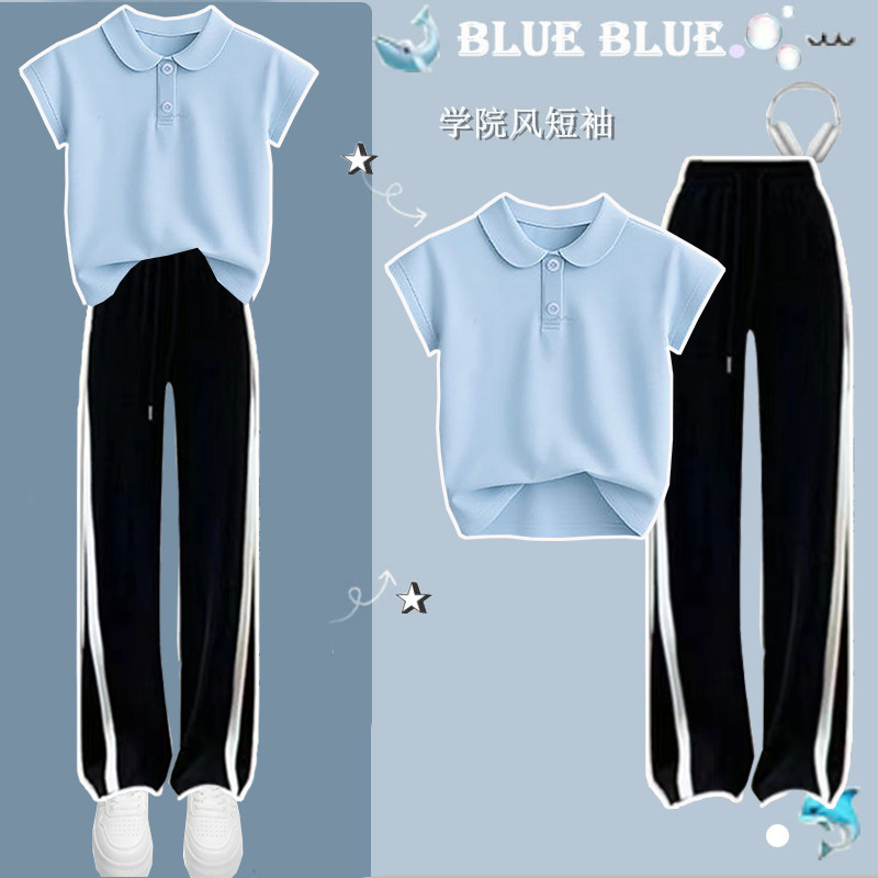 女童纯棉POLO衫套装夏季中大童洋气小女孩夏装冰丝阔腿裤两件套潮