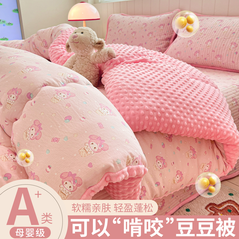 双层纱豆豆绒四件套被子被芯冬被春秋被单人被套加厚保暖床盖套件