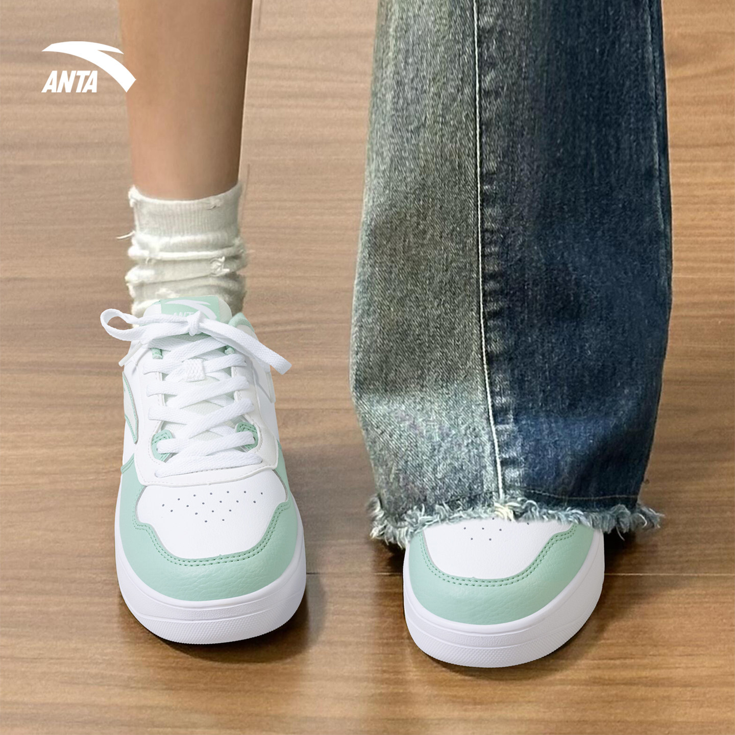 安踏板鞋女海盐蓝学生简单百搭运动秋冬保暖皮面时尚低帮休闲女鞋