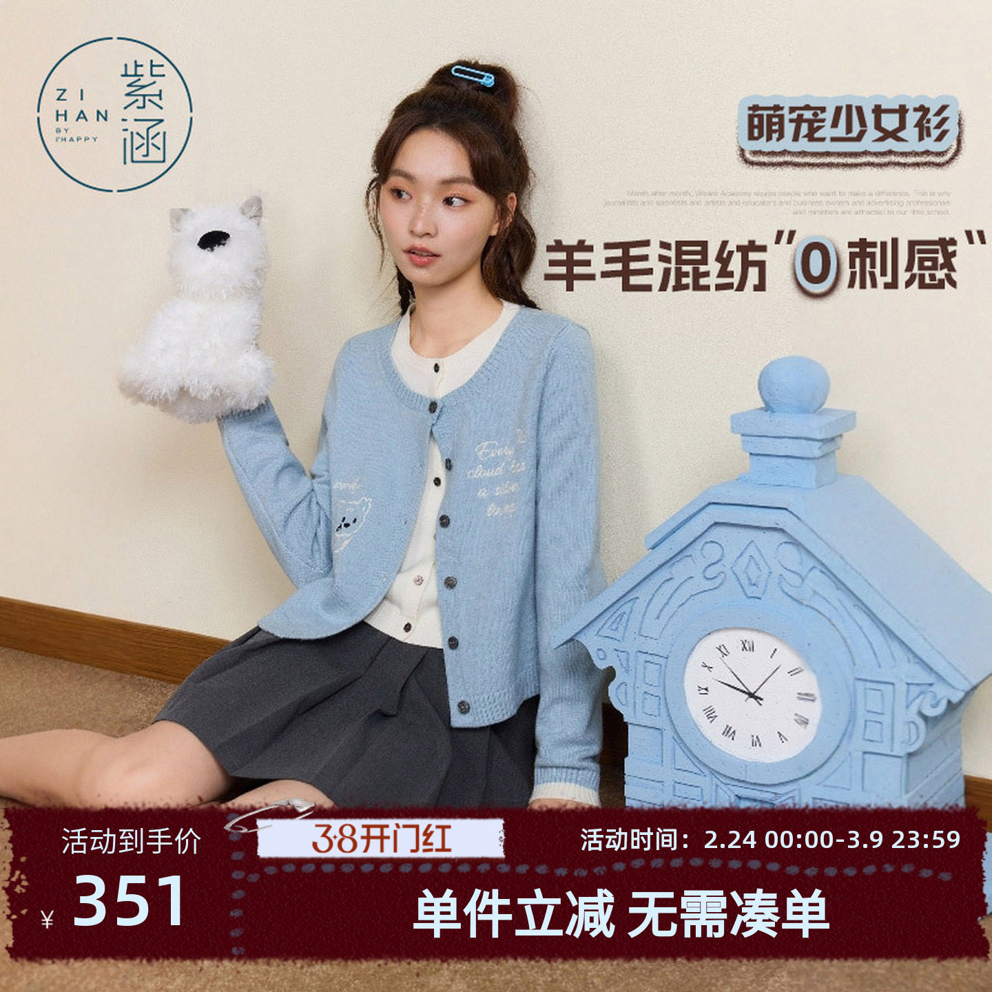 紫涵圆领假两件蓝色毛衣开衫女秋季新款刺绣设计感宽松针织衫上衣