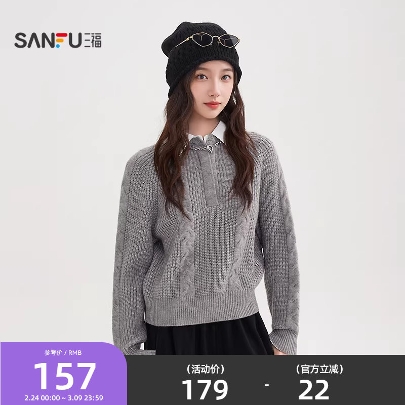 三福套头毛衣2025新款冬季假两件麻花纹理宽松休闲上衣女装516424