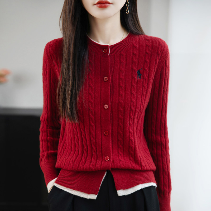 春秋针织假两件开衫女翻领拼色刺绣麻花毛衣宽松纯色针织外套上衣