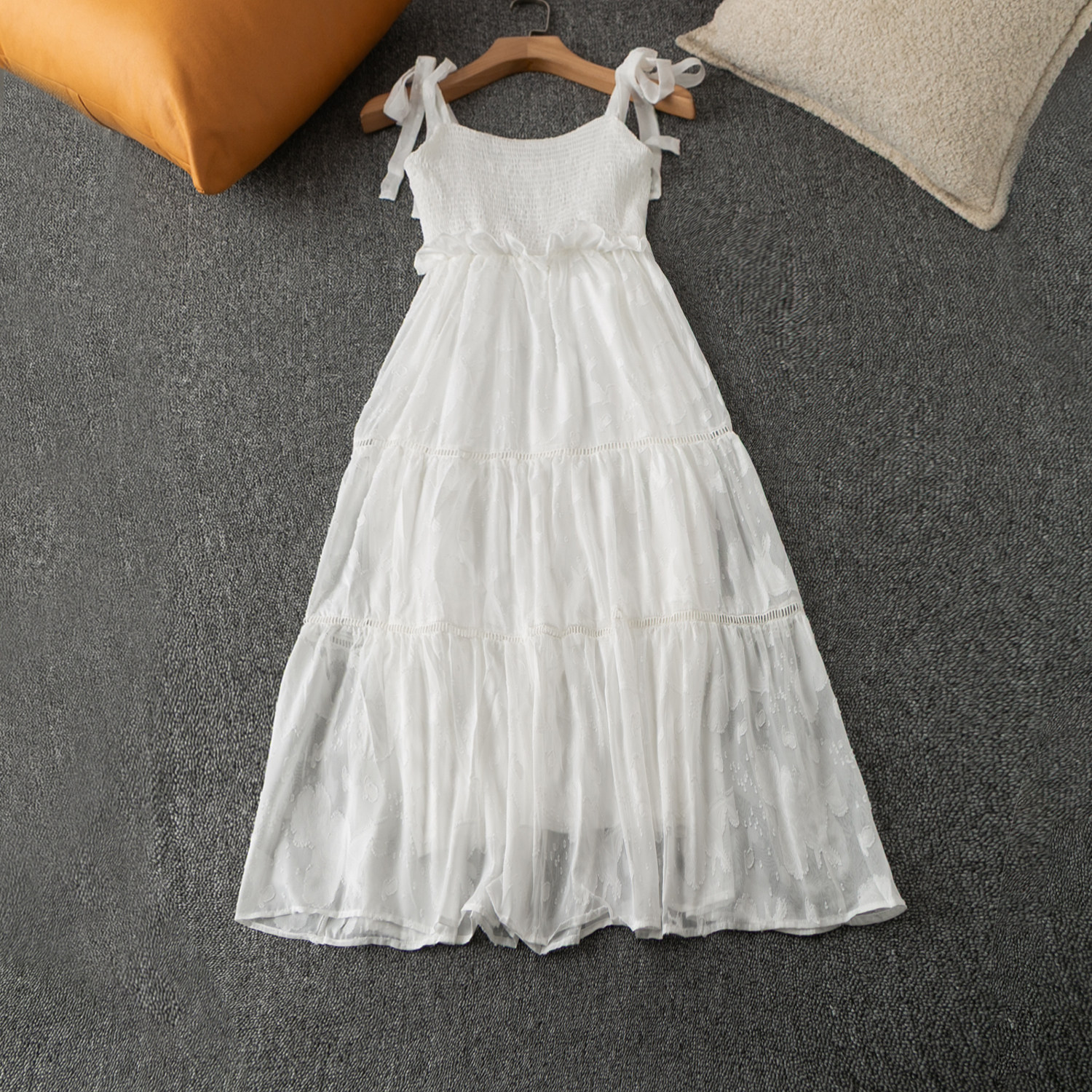 法式重工蕾丝白色连衣裙女夏纯欲风设计感小众超仙流苏羽毛吊带裙