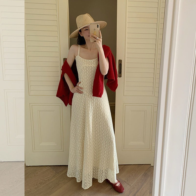 instahot 韩版白色吊带连衣裙女2025夏季新款绝美蕾丝修身连衣裙