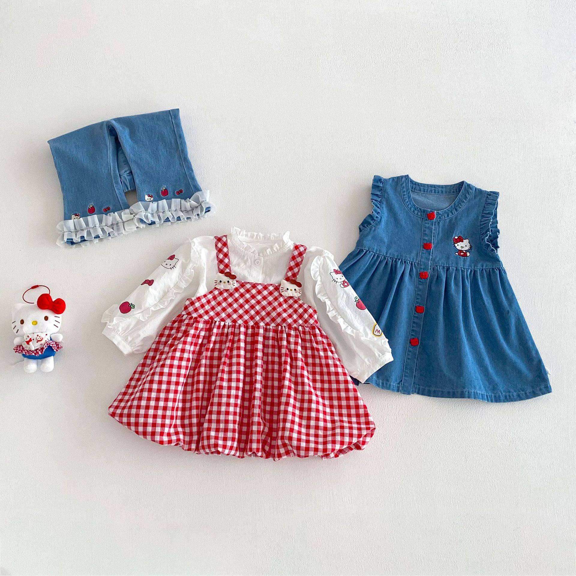 女童格子花苞裙2026新款春季宝宝韩版吊带裙儿童卡通猫咪连衣裙潮