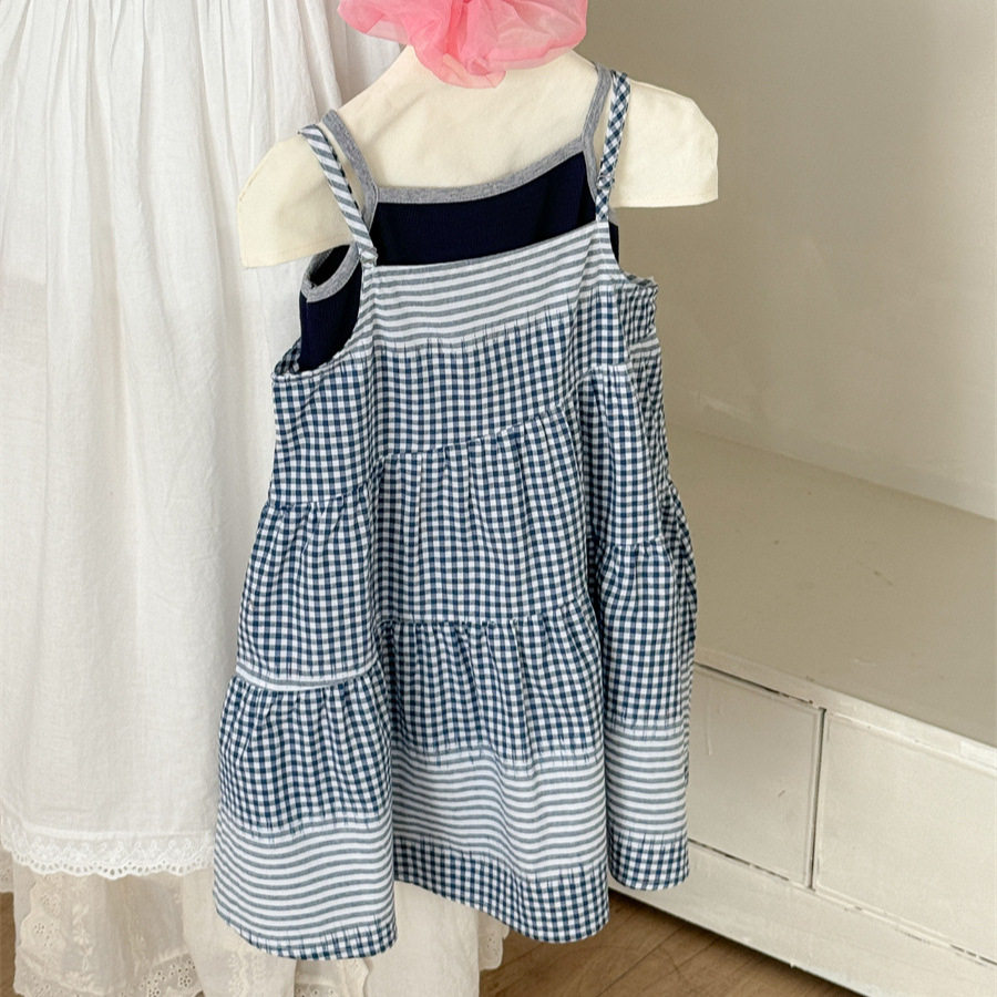 森林贝儿女童2026春季新款韩版吊带裙潮范蓝色格子条纹吊带裙
