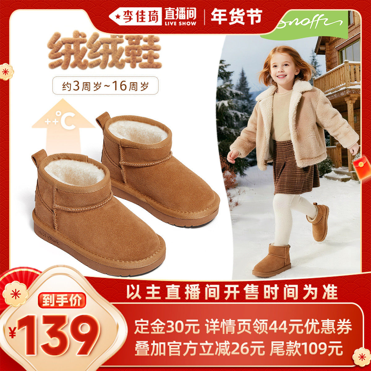 【李佳琦年货节全品类预售】斯纳菲女童雪地靴冬新款儿童加绒棉鞋