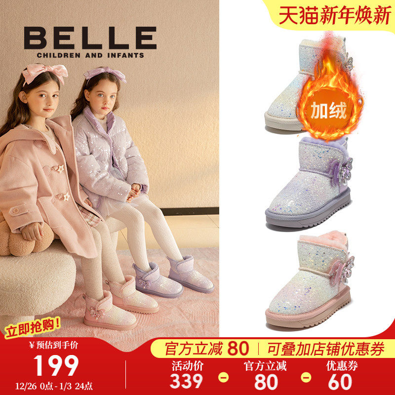 百丽童鞋女童雪地靴2025冬季新款加绒加厚靴子儿童棉鞋大童宝宝靴