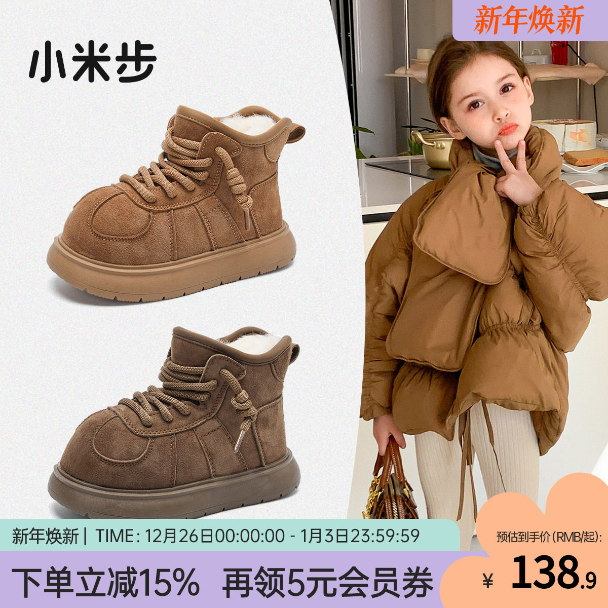 小米步女童雪地靴2025冬季新款儿童加绒棉鞋男童保暖防滑大棉靴子