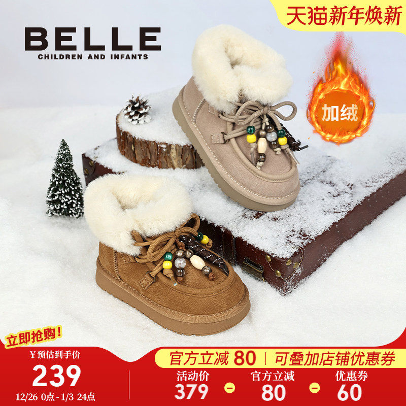 百丽童鞋女童雪地靴2025冬季新款加绒保暖儿童棉鞋中大童毛毛短靴